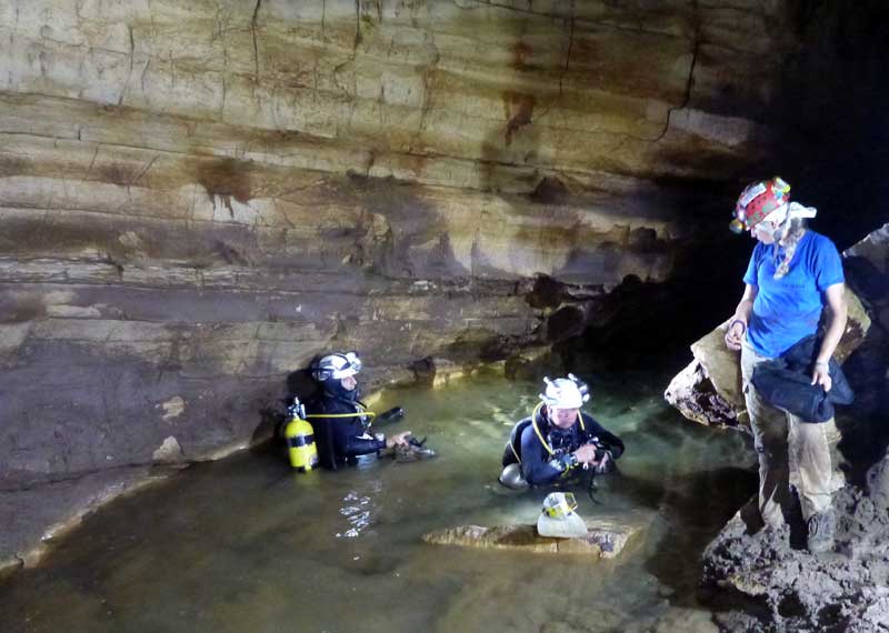 Ci si è divisi in due gruppi. Uno si è diretto all’Aguacero, una grotta in parte turistica. Mancavano il rilievo completo e le analisi delle acque. Ora ci sono. Grazie all’aiuto della Protezione Civile le acque campionate in vari punti della grotta sono state portate al più vicino laboratorio di analisi e presto sapremo i risultati. Al fondo della grotta (una risorgenza) è stata anche tentata un’immersione. Purtroppo la visibilità pressoché nulla ha fermato gi speleosub a soli 60 metri dall’accesso del sifone.