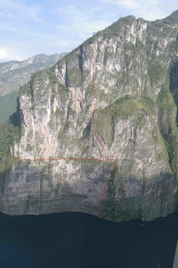 Può essere un nuovo punto di accesso meno impegnativo, e soprattutto una bella esplorazione. Riuscire a spostarsi lungo le pareti in orizzontale seguendo linee e terrazze naturali è sempre stato un gioco a noi congeniale, fin dai tenpi di Samarcanda 89, e poi moltissimo nel canyon del Rio la Venta. Sono arrivati ad un punto dove ancora non si vede la cengia, bisogna girare un ultimo angolo ma per farlo servono chiodi e corda.