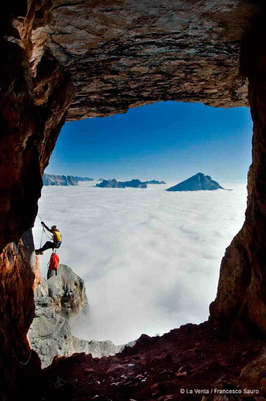 Many efforts have been spent for the explorations of caves and abysses. On the north-west wall, with a descent of almost 200 meters, the speleologists Antonio De Vivo from Treviso reached a big cave, facing almost 1000 meters of wall. A wonderful window on the Dolomites.