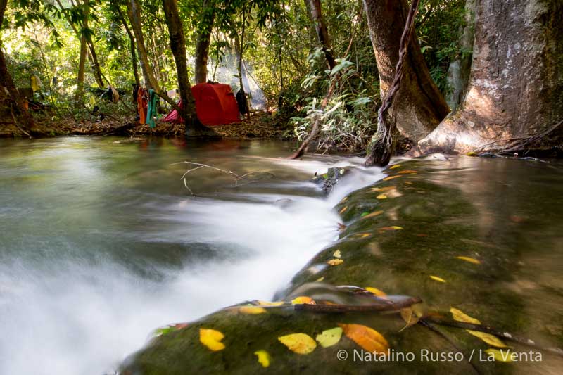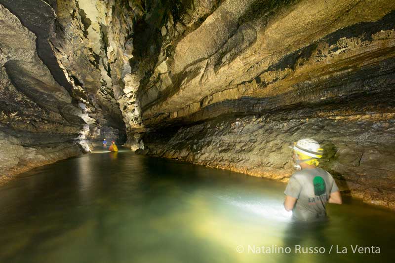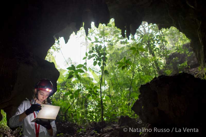 Contemporaneamente, un altro gruppo ha raggiunto la zona de La Conchuda, in destra orografica del canyon del Rio La Venta, dove un’imponente cascata segnala la presenza della risorgenza di Los Bordos: esplorata dai francesi alla fine degli anni ’80, la grotta riservava alcune incognite che avevamo provato a indagare l’anno scorso, e che abbiamo sciolto quest’anno: risalendo il corso del fiume sotterraneo, tra rapide e immensi canyon ipogei, abbiamo portato l’esplorazione e il rilievo a oltre 5 km di sviluppo complessivo. Il posto, sia sottoterra sia fuori, è fantastico: grandi vasche d’acqua turchese in mezzo alla foresta, flora rigogliosa e ogni tipo di animali. Ma l’avvicinamento è reso arduo dai dislivelli e, nella parte finale, dall’assenza di un vero e proprio sentiero, il che ci ha costretti a faticose arrampicate con tutti i materiali da campo. È stata una settimana emozionante, con le nostre tende piantate tra le rovine di una città perduta: per la sua incredibile bellezza, il posto fu abitato dagli Zoque, che vi costruirono templi e altri edifici, utilizzando le grotte come luoghi di sepoltura e santuari. A poche centinaia di metri dalla risorgenza di Los Borsos si apre El Porche, un portale alto circa trenta metri e profondo quaranta: incisioni e pitture rupestri al suo interno raccontano del tempo in cui questo fu un grande e importante santuario. Ci siamo entrati in punta di piedi, col fiato sospeso per l’emozione.