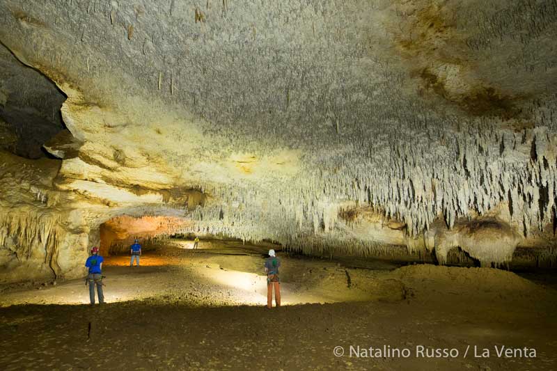 A San Rafael abbiamo dormito nel rancho di don Umberto, una casa modestissima col pavimento in terra battuta, ci siamo svegliati prima dell’alba, tra le galline e qualche cane smunto, sotto gli occhi incuriositi di una decina di bambini. Il sole sorgeva poco dopo, colorando di rosa la foresta persa nella nebbia. Don Umberto ha la passione per le grotte: si è procurato un casco in alluminio e, torcia in bocca, si avventura nelle caverne che si aprono nei suoi oltre venti ettari di foresta. Ci ha accompagnato alle grotte più vicine al suo rancho: alcuni spettacolari pozzi che chiudono tra i 40 e i 60 metri di profondità, uno particolarmente imponente che arriva a -75, e una grotta fossile che lui stesso aveva percorso per alcune centinaia di metri. È lì che abbiamo concentrato i nostri sforzi esplorativi, rilevando in due giorni quasi due chilometri di grandi ambienti, fino a un imponente attivo, con spiagge sotterranee e foreste di concrezioni eccentriche. La grotta è labirintica, ma tutte le vie che abbiamo seguito conducono a crolli, concrezionamenti e sifoni di fango. Tuttavia c’è aria, e in alto occhieggiano finestroni bui e probabili meandri. In questa e in altre grotte della zona avremo di che divertirci in futuro.
