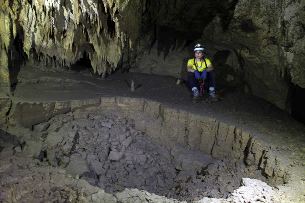 Dopo un breve pozzo di cica 15 metri ed uno scivolo pietroso arriviamo in un bel paio di sale concrezionate. Da qui un breve saltino dà su un meandro. Peccato sia chiuso a monte ed a valle da sifoni. Ma la presenza di acqua ci stimola a cercare meglio e...