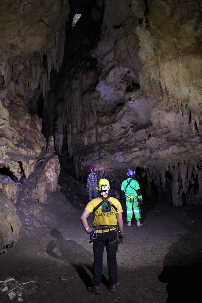 Un breve pozzetto tra concrezioni ci fa affacciare su una enorme galleria. Da lì inizia la pazza corsa che va avanti circa 800 metri. Affondiamo a volte letteralmente nel fango. Segno che quando il sistema va in piena qui l'acqua deve scorrere potente. Bypassiamo un pozzetto che ci riporta rumore di torrente non avendo più corde e continuiamo fino a perderci in una grande sala concrezionata. Ravaniamo un po' in giro ma il tempo è tiranno. Domani dobbiamo partire per una tre giorni e bisogna preparare tutto il materiale. Così torniamo sui nostri passi ripromettendoci di tornare a cercare meglio, scendere sul torrente e terminare la topografia.