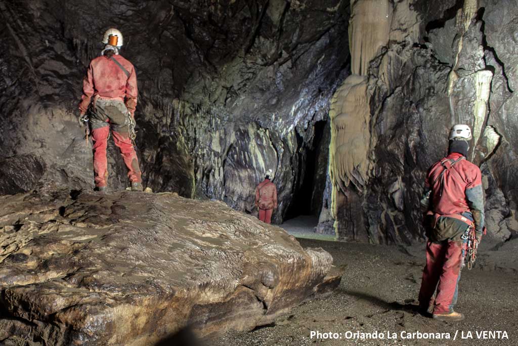 Simultaneously outside near the entrance of the same Shtares, a team has been engaged for 4 days in the construction of a mountain road in the wall to reach some promising holes, seen last year with the drone. The effort of this team was not in vain, indeed. During the ascent, other very promising cavities have been identified. The goal was to reach the great well seen with the flight of the drone, but rising it was identified by another strong breath, this time entering, which develops on a well-meander, but closed by giant landslides that now prevent the continuation. Another conduct of some tens of meters, always discovered during the ascent, was instead a providential shelter during the last exit, which had been dedicated to reach the Shpella and Dalandysheve (cave of the Swallows) and explore it. But because of a strong storm, three of us stayed on the wall, waiting for several hours for this to pass. When they left, however, it was already late afternoon. This year will surely be the main objective to continue the explorations in the Shtares.